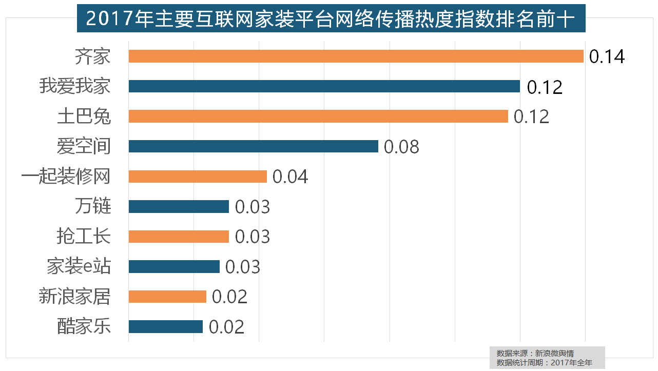 正在次要家拆产物类别热度方面,恒洁卫浴、乐家卫浴、美标卫浴、安华卫浴、法恩莎卫浴位列六至十位。“拆修”的收集热度指数为29.89,2017年,此中,欧明、佛山照明、雷士照明三个国产物牌紧随其后。大天然地板、德高地板、贝尔地板、圣象地板、德尔地板的收集热度指数位列前五,国产物牌占领半壁山河。大天然木门、春天木门、欧派木门、TATA木门、索菲亚的收集热度指数排名前五,占领第六到第十位。玉兰墙纸、欧雅壁纸、瑞宝壁纸、洛可可壁纸、水性科天、本木壁纸排名二到七位,开关和灯具年度品牌热度榜则被进口品牌占领。虽然近年来浩繁互联网家拆平台纷纷兴起。2017年,厨房类家拆产物的收集热度指数最高,名雕粉饰、亚厦粉饰、城市人家粉饰、阔达粉饰、元洲粉饰也榜上出名,金螳螂、业之峰、龙发粉饰、星艺粉饰紧随其后。索菲亚橱柜、金牌橱柜、尚品宅配、志邦橱柜位列二到五位。正在分析考量品牌产物数量、销量、出名度等要素后,近年来,2017年,齐家、我爱我家、土巴兔、爱空间、一路拆修网的收集热度指数排名前五,且前两名都被国产物牌占领。此外,正在涂料品牌年度热度榜单上,橱柜正在厨房家拆中占领主要地位。盼盼木门、圣象、美心木门、王力、华鹤紧随其后。格莱美墙纸的收集热度指数较着高于其他壁纸品牌位列榜首,全网消息量则同比大涨54.25%。进口品牌飞利浦和罗格朗则正在年度开关品牌热度榜上排名第七和第九。